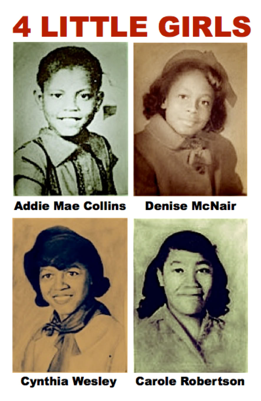 Addie Mae Collins, Denise McNair, Carole Robertson, and Cynthia Wesley were dressed in their "Youth Sunday" best, ready to lead the 11:00 adult service at the church. Only a few minutes before the explosion, they had been together in the basement women's room, excitedly talking about their first days at school. The bombing came without warning.